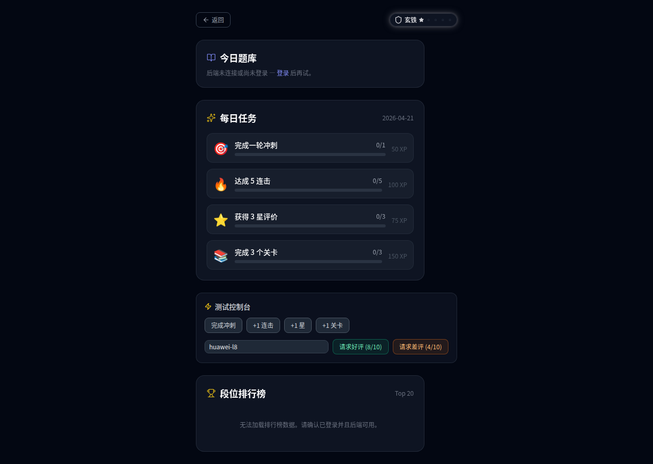 背景:为提升用户粘性和学习动力,对标原神/王者荣耀的参与感设计,新增四大系统:Boss 血条多阶段战斗、7段位竞技系统、连击全屏爆发效果、每日任务卡片。所有功能使用已有的 framer-motion + Canvas 2D + lucide-react,零新依赖。